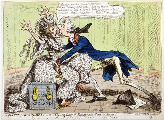 The nickname first appeared in a print by James Gillray in 1797. The cartoonist personified the Bank of England as a distressed elderly woman fighting off the grasping hands of the then Prime Minister, William Pitt.