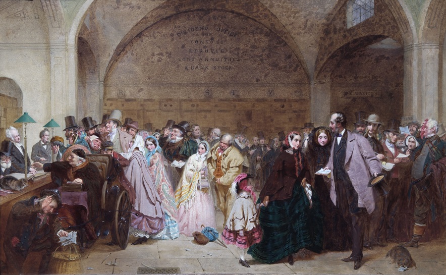 This 1859 painting shows a scene at the Bank of England. There are Bank clerks and businessmen – but also customers of different levels of prosperity, women, children with their parents, and a man in a wheelchair.