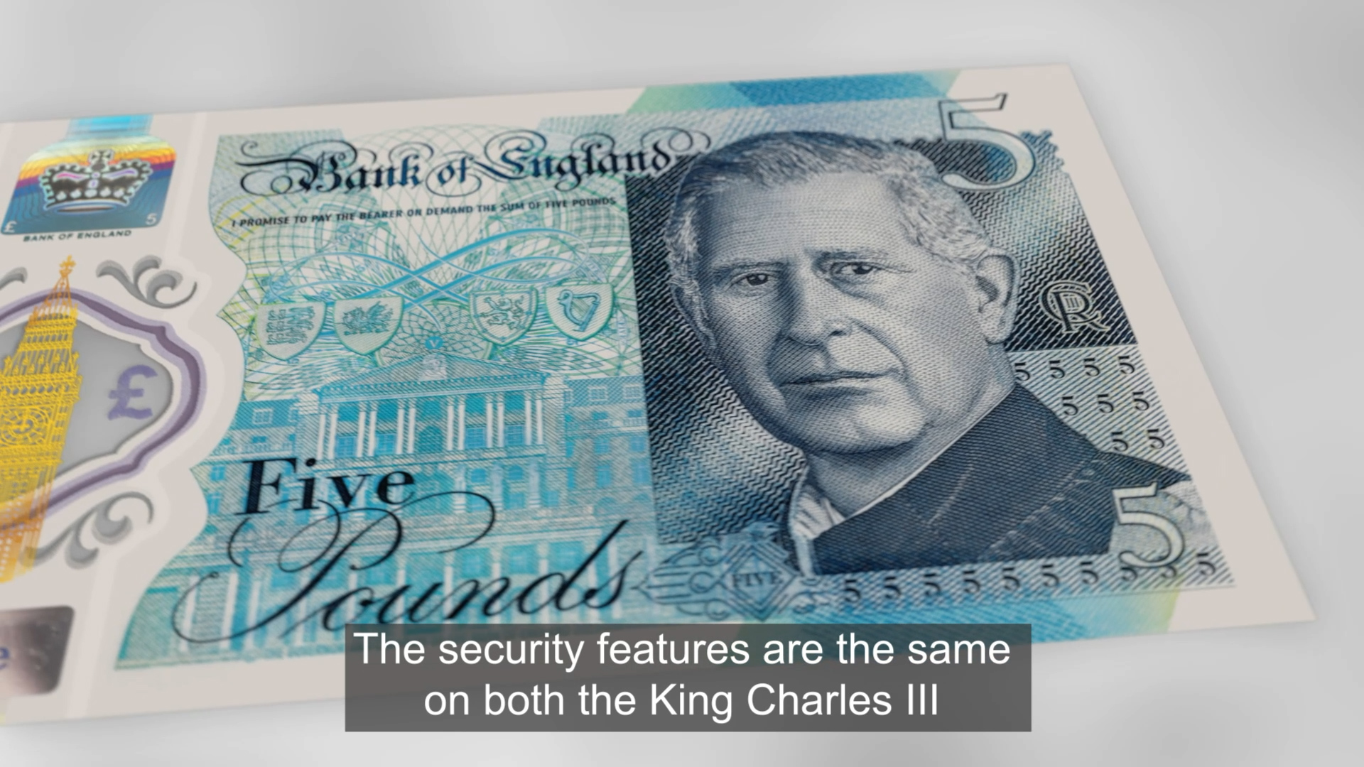 A portrait of the monarch is printed on the window with '£5 Bank of England’ printed twice around the edge.