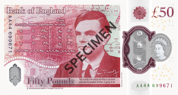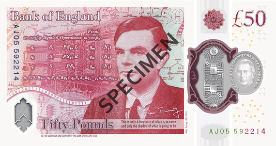The design on the reverse of the note celebrates Alan Turing and his pioneering work with computers. It features: