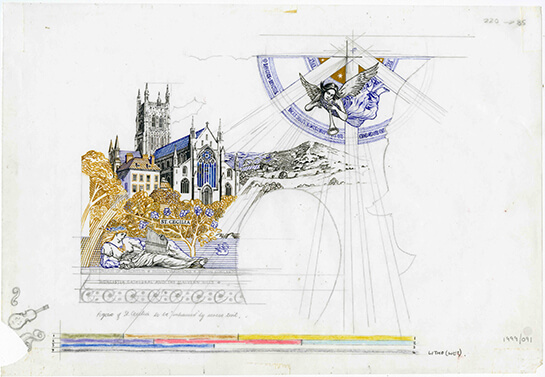 Saint Cecilia is the patron saint of musicians. An image of her was included in the foreground of this design for the £20 note featuring composer Edward Elgar.
