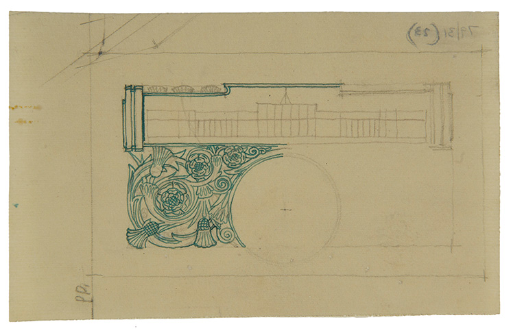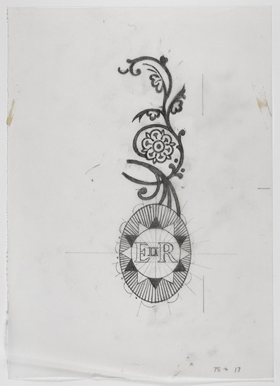 The note’s designer William Keesey made this sketch for it. It shows the Bank’s Threadneedle Street building above a floral design incorporating English roses, Scottish thistles and Welsh daffodils.