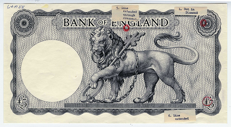This guide sheet highlights the secret marks on the 1956 £5 Series B banknote.