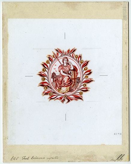 This master drawing by designer Roger Withington is for a vignette, or small decorative design, of Britannia.