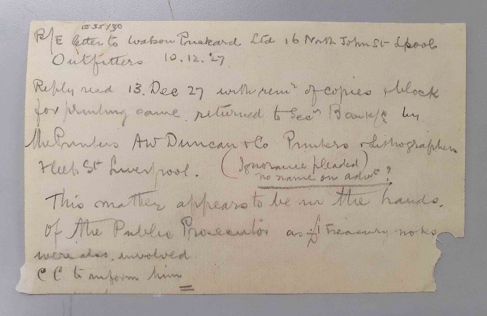 Reply recd [received] 13. Dec 27 with rem[ittances] of copies & block for printing came returned to Sec[retary] of Bank by the Printers AW Duncan & Co Printers & Lithographers Fleet St[reet] Liverpool (ignorance pleaded, no name on audit).'
