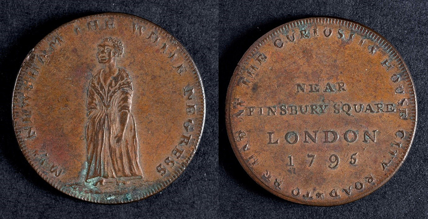 Amelia toured the country as a curiosity for most of her life, and was baptized in Exeter, in Devon, as Amelia Harlequin. Believing her baptism made her free, she left John Burnett, exhibiting herself by her own rules. Souvenir coins were made with the likeness of the ‘White Negress’ and sold at fairs like Bartholomew fair, in Smithfield, London, where she exhibited herself. She married an Englishman, Mr Newsham, and had at least six children.