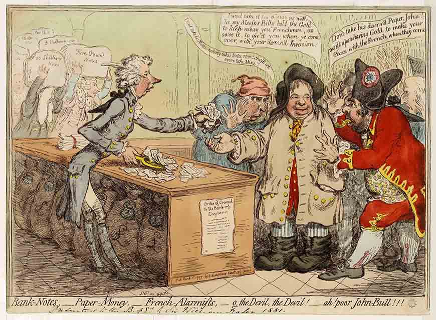 By 1797, government spending and public hoarding of coins in response to the French Revolutionary Wars (1792-1802) and the Napoleonic Wars meant the UK’s gold reserves had been severely reduced. When Parliament passed the Bank Restriction Act in 1797, the public were not happy. The Act allowed for the Bank of England to halt the exchange of banknotes for coins. Additionally, they were allowed to produce smaller value banknotes, such as the £1 banknote, to make up for the shortfall in gold and cash reserves. This was at a time when most of the population weren’t using banknotes daily, if at all, and so trust in this ‘paper money’ hadn’t been fully established.