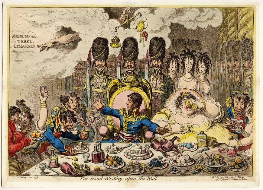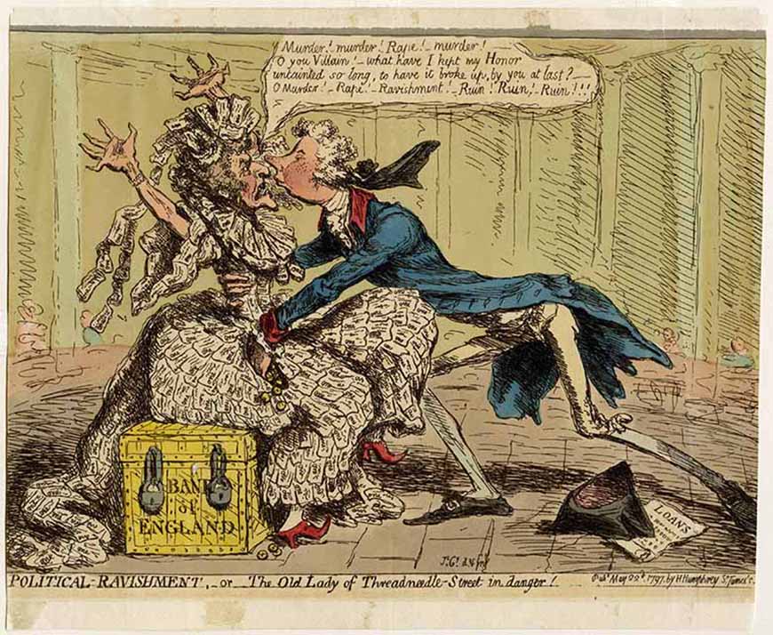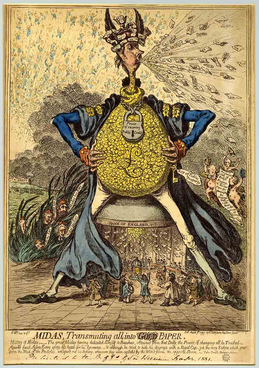 In the print ‘Midas Transmuting all into (Gold) Paper’ Gillray shows the Prime Minister, William Pitt the Younger, as King Midas. In a reversal of the original tale, instead of turning everything he touches into gold, this version of Midas turns everything he touches into paper. Gillray even takes it one step further and shows ‘Midas’ eating all the gold reserves and spewing out banknotes.