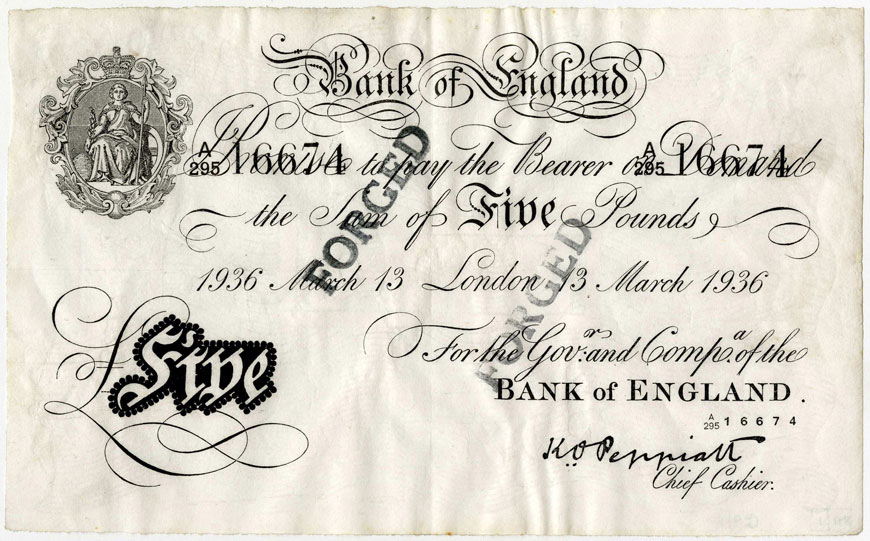 Operation Bernhard counterfeits turned up in circulation for a number of years after the War. It wasn’t until some 20 years later, in 1964, that a £10 note was reintroduced, followed by £20 in 1970, and by £50 in 1981. These new notes were more sophisticated and colourful than the elegant white banknotes they replaced and much harder to counterfeit.