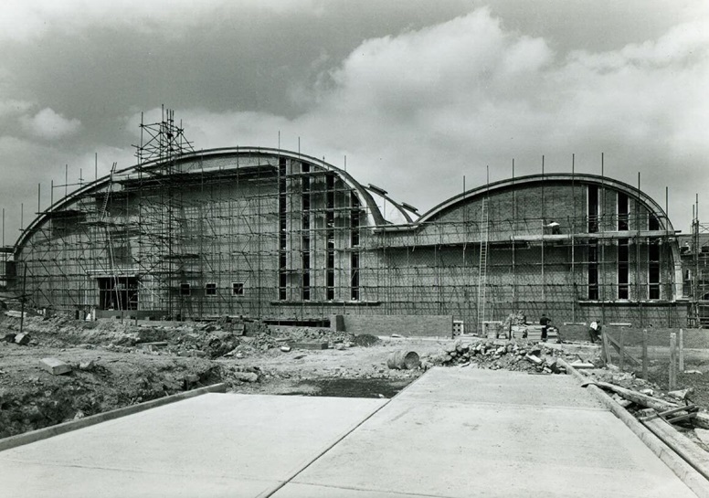 The reinforced concrete roof arches of the main production hall were cast in pieces on site, and then lifted into place.