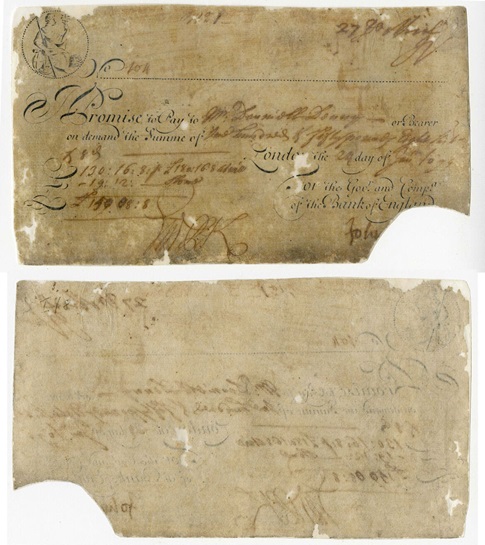 Printed features, like the Britannia medallion and the ‘promise to pay’ on this example, began to be included on Bank of England notes in the late 1600s.