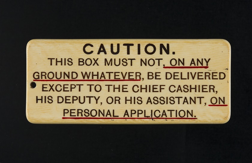 This label shows the layers of administrative bias that women have faced when entering traditionally male roles: the box was for ‘the Chief Cashier, his deputy, or his assistant.’