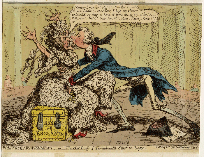 Unsurprisingly, some politicians were horrified by the Government’s actions. The MP, and notable playwright, Richard Sheridan, described the Bank as, ‘an elderly lady in the City who had..… unfortunately fallen into bad company’. Gillray latched onto these words and, on 22 May 1797, published a cartoon called “Political Ravishment or the Old Lady of Threadneedle Street in Danger”.
