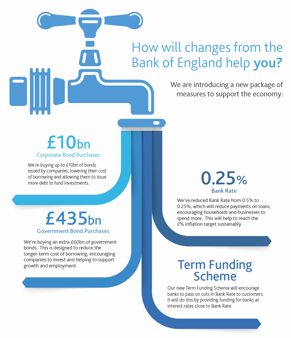 - A cut in Bank Rate from 0.5% to 0.25% alongside a new measure to ensure that banks can pass this on to their customers.
