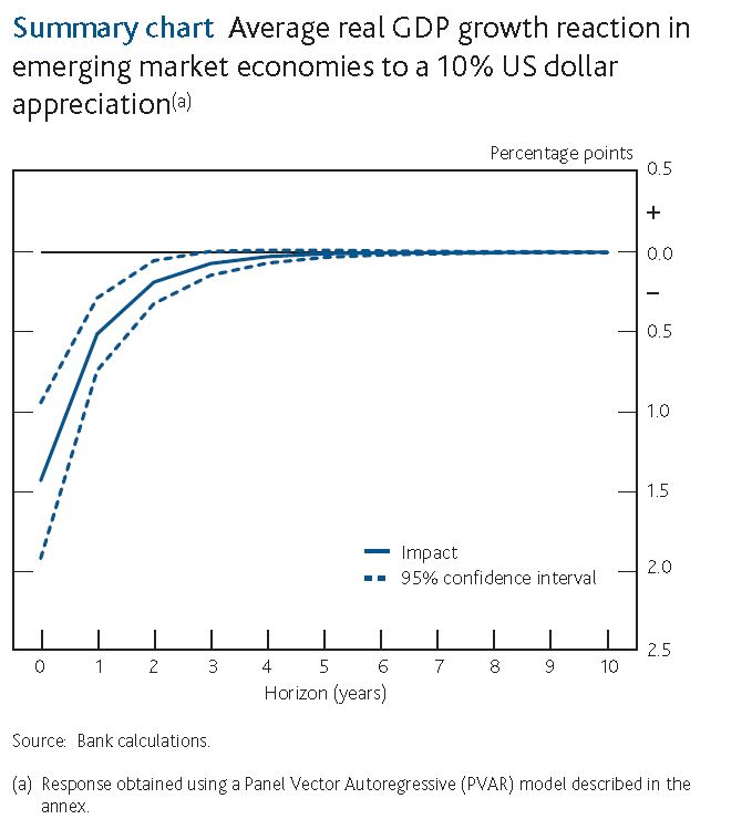 The traditional external trade channel would imply that when the US dollar appreciates against another country’s currency, the products of that country become more competitive relative to US products, boosting its exports and output. But if its exports are invoiced in dollars, that gain in competitiveness may not materialise. And if companies have borrowed in dollars, the amount of domestic currency needed to repay that debt will have increased, raising the burden of the debt, and acting as a drag on growth. By contrast, those who hold dollar assets, for example governments with large US dollar reserves, will experience a gain in wealth, which might support spending and hence growth. These various channels mean that it is not straightforward to estimate the impact of an appreciation of the dollar on the output growth of the rest of the world.